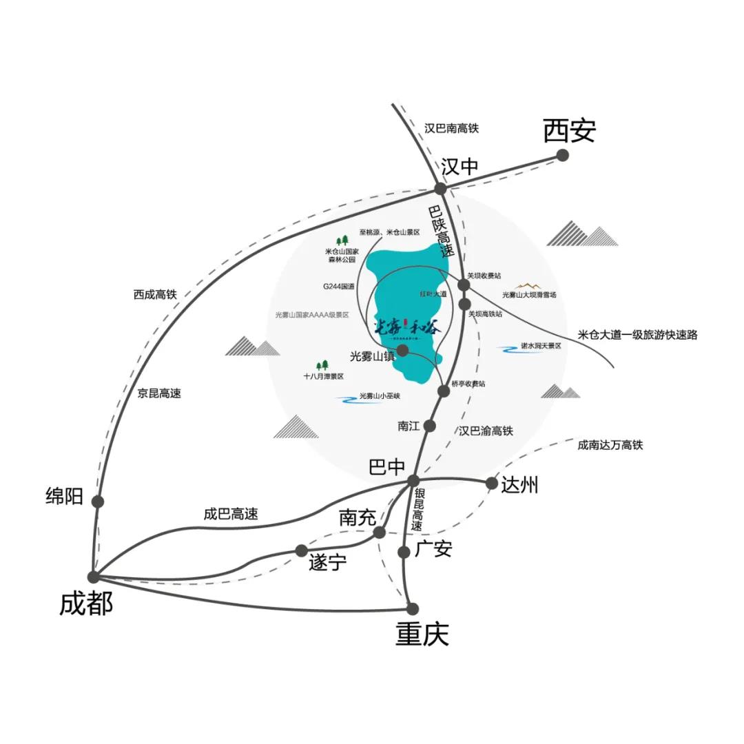 酒店位于四川·巴中市的光霧山鎮——光霧和谷國際森林康養小鎮。背靠光霧山AAAA級風景名勝,周邊緊密分布著米倉山國家森林公園、光霧山-諾水河世界地質公園、小巫峽、恩陽古鎮、十八月潭等景區。隨著米倉大道旅游快速路快速建成,這里將成為光霧山度假區中心樞紐,賓客們在這能包攬自然風光,享受完美旅游度假生活。